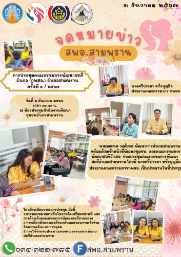 นายมณฑล วงศ์เทศ พัฒนาการอำเภอสามพราน พร้อมด้วยเจ้าหน้าที่พัฒนาชุมชน และคณะกรรมการพัฒนาสตรีอำเภอ ร่วมประชุมคณะกรรมการพัฒนาสตรีอำเภอสามพราน โดยมี นางศรีประภา หรั่งบุญลือ ประธานคณะกรรมการกพสอ. เป็นประธานในที่ประชุม โดยมีระเบียบวาระการประชุม ดังนี้