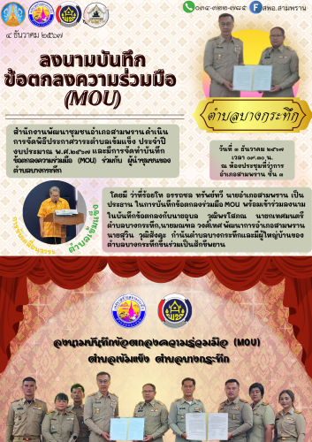 สำนักงานพัฒนาชุมชนอำเภอสามพรานดำเนินการจัดพิธีประกาศวาระตำบลเข้มแข็ง ประจำปีงบประมาณ พ.ศ.2567 และมีการจัดทำบันทึกข้อตกลงความร่วมมือ (MOU) ร่วมกับผู้นำชุมชนของเทศบาลตำบลบางกระทึก โดยมี ว่าที่ร้อยโท อรรถชล ทรัพย์ทวี นายอำเภอสามพราน เป็นประธาน ในการบันทึกข้อตกลงร่วมมือ MOU พร้อมเข้าร่วมลงนามในบันทึกข้อตกลงกับนายอุบล วุฒิพรโสภณ นายกเทศมนตรีตำบลบางกระทึก,นายมณฑล วงศ์เทศ พัฒนาการอำเภอสามพราน นายสุวิน วุฒิสังคะ กำนันตําบลบางกระทึกและมีผู้ใหญ่บ้านของตำบลบางกระทึกร่วมเป็นสักขีพยาน ณ ชั้น 3 ห้องประชุมที่ว่าการอำเภอสามพราน